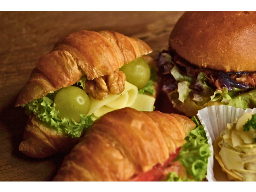 - Mini croissant slaný - 3 ks (sýrový - nivová pomazánka, sýr eidam, hrozno bílé, vlašský ořech, lososový - lososová pomazánka, losos uzený, vejce, paprika červená, salát lolo biondo, šunka & sýr - máslo, šunka, sýr eidam, rajče čerstvé, salát lolo biondo)