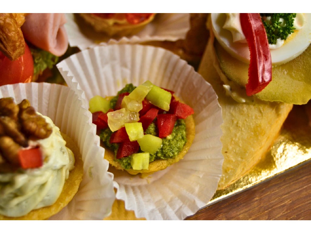 - Košíček slaný - 4 ks (s paštikou - máslo, mandlová paštika, mandle, petrželka, s paprikášem - máslo, salám paprikáš, oliva, polníček, s bylinkovým pestem - bazalkové pesto, okurka, paprika, nivový - nivová pomazánka, vlašský ořech, paprika, petrželka)