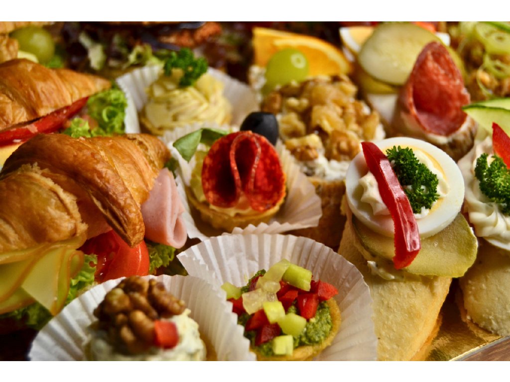 - Mini chlebíček - 3 ks (šunkový - podmazový salát, šunka, vejce, paprika červená, okurka sterilovaná, petrželka, vajíčkový - podmanivý salát, vejce, okurka, paprika červená, majonéza, petrželka, nivový - nivová pomazánka, cibule, rajče, paprika červená, salát, petrželka)