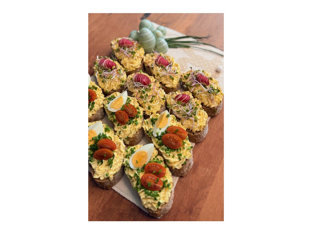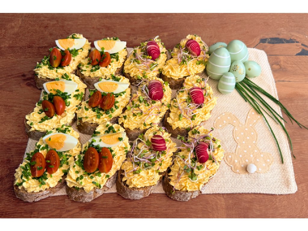 Složení: dřevorubecký chléb, vajíčková pomazánka, vajíčkovo-křenová pomazánka, vejce, ředkvička, výběr z klíčků, pažitka, cherry rajče