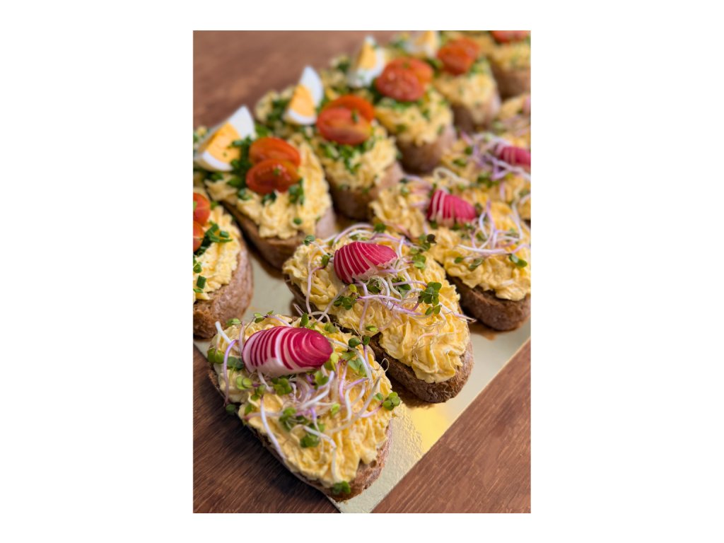 6x dřevorubecký chlebíček s vajíčkovo-křenovou pomazánkou a cherry rajčátkem