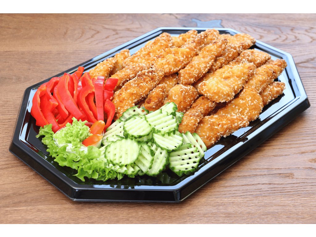 Složení: kuřecí stripsy (40 ks), paprika, okurky, salát, rajčata cherry, dresink