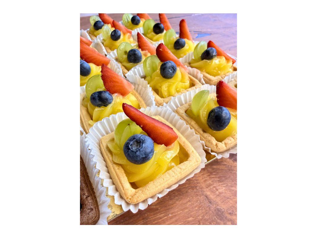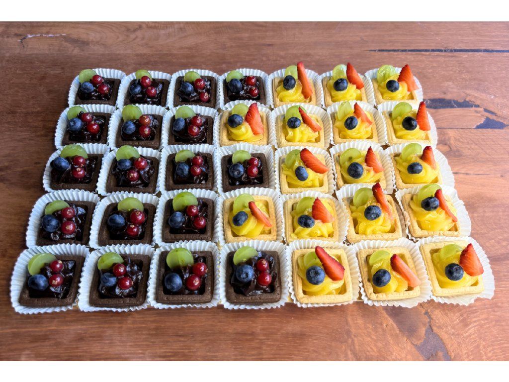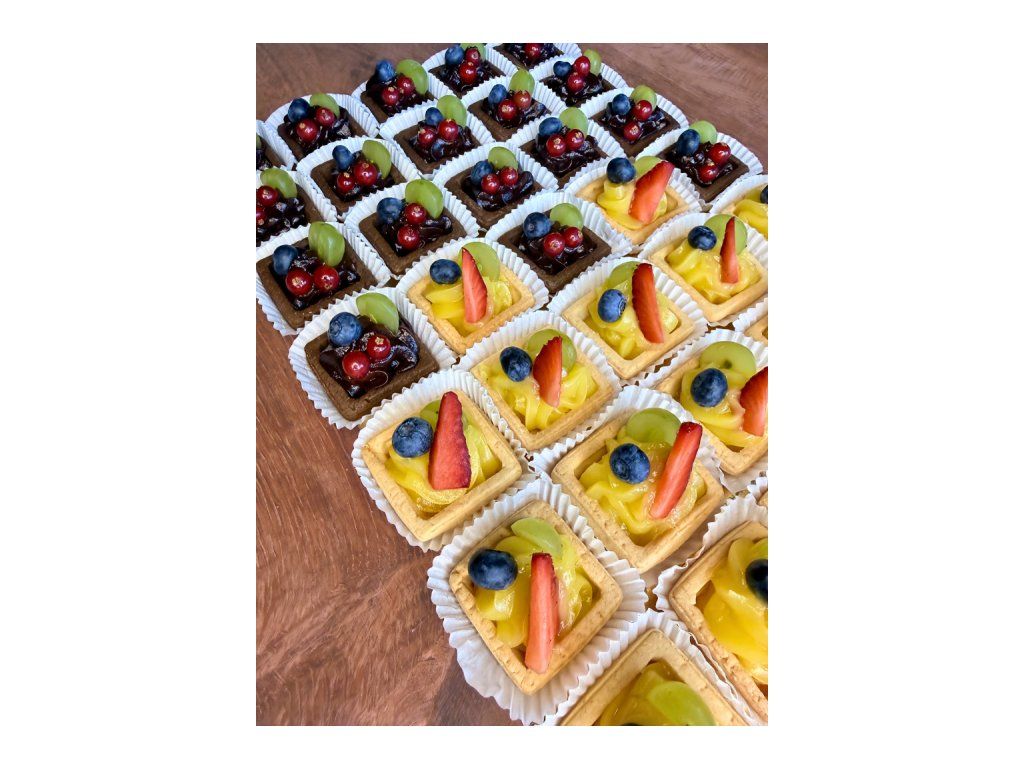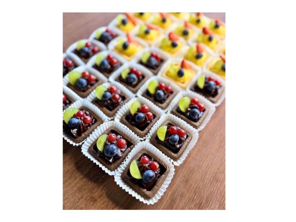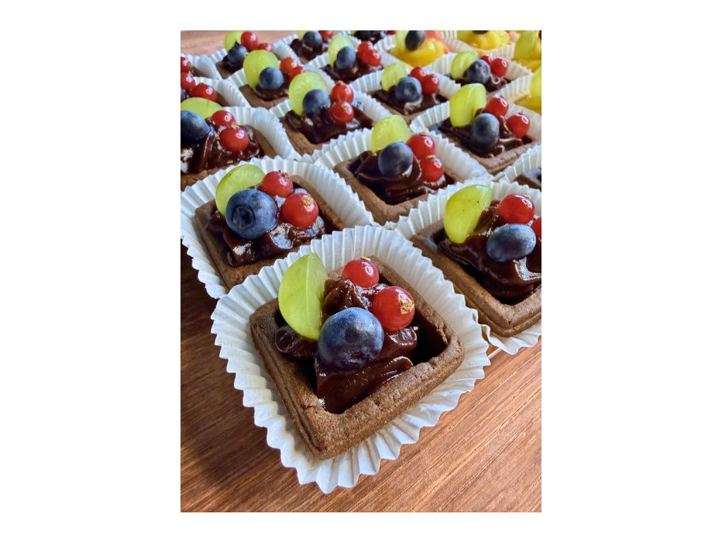 Složení: košíček máslový vanilkový/čokoládový, puding vanilkový, puding čokoládový, čerstvé ovoce